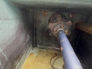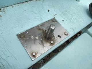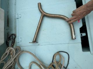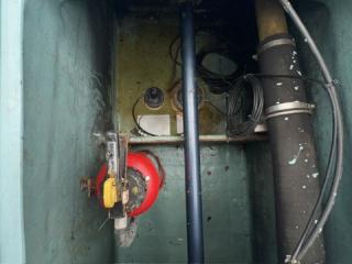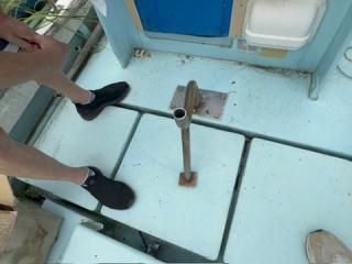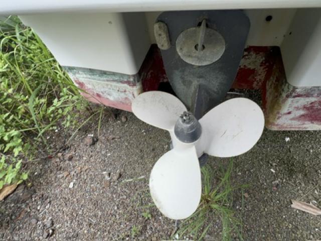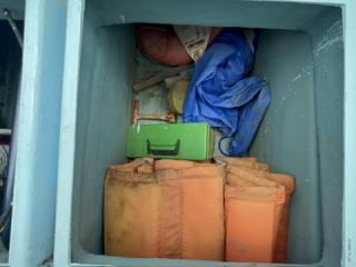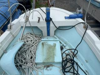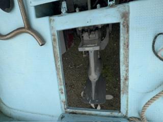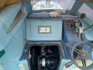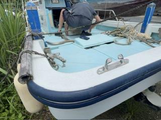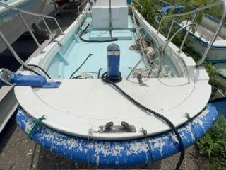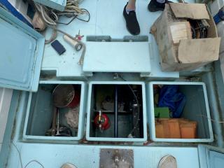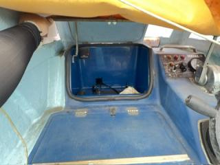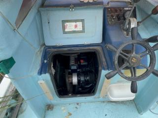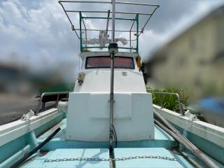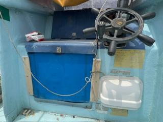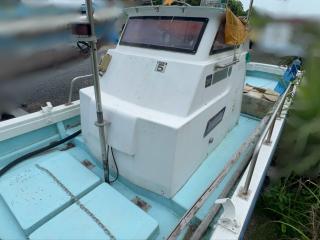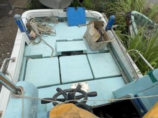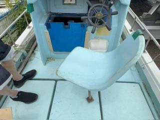 デッキは一部盛り上がっている所がありますが、ほぼフラットで釣りや作業の妨げになるほどではないように思われます。操縦は椅子を取り付けることが出来、座って行うことが出来ます。物入が2ヵ所。全体的に汚れていますが、清掃して塗装すると見違えるかもしれません。取材時に、とくに気になるような大きな損傷箇所は見られませんでした。船底塗装の必要あり。