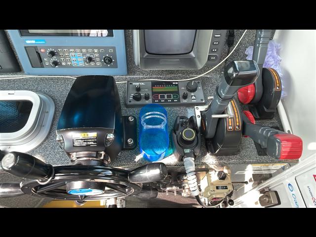 スラスタージョイステック、魚探、プロッター、レーダー、オートパイロット、3ダイヤルリモコン等、舵リモコンなど、古いですが一通りの計器類は揃ってます。