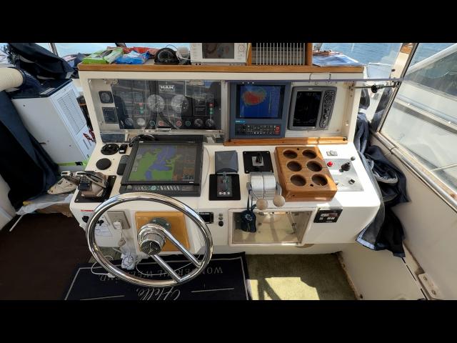 広いスペースのフライブリッジで、運転席は各1人用x2脚のシートを装備し(R3年に張り替え)、GPS漁探およびレーダー・ソナー・無線・オーディオ・オートパイロット・オートヘルム等を装備しています。