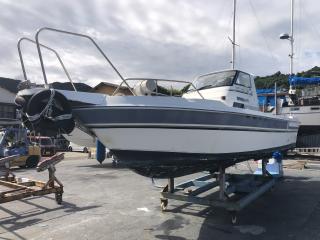 115馬力の船外機でマリントイレ付き。愛媛県中央部での係留引き継ぎ可能です。